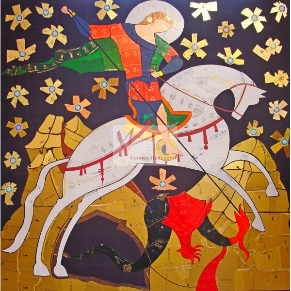 Collage original de Vianney Frain, d'après une icône ancienne représentant St Georges terrasant le dragon.